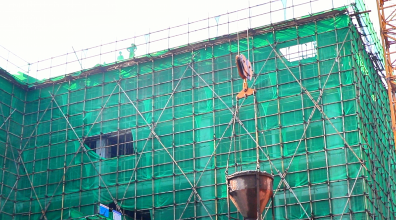 在项目建设现场,只见两栋覆盖绿色防护网的主体建筑拔地而起,即将封顶。塔吊持续运转运输建材,工人们正在楼顶、室内同步开展砌筑、管线铺设等作业,施工现场一派繁忙景象。
