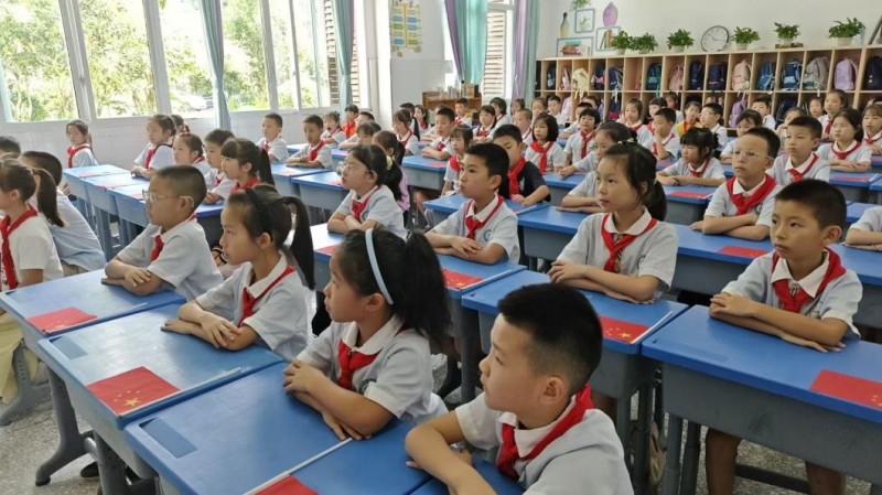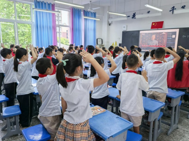 教室里,各班多媒体传来雄壮的音乐声,孩子们拿着小国旗有序地挥舞着,怀着激动的心情等待阅兵式开始。跟随着直播画面,孩子们起立、敬礼、高唱国歌,热烈鼓掌,沉浸其中,不时发出惊呼和赞叹声,为新时代祖国的繁荣昌盛感到无比自豪。