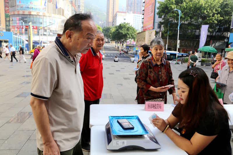 “大爷你看,咱们可以称一下手机的重量,贴上克数标签。”现场工作人员拿出检验合格的电子秤,一边演示一边向市民详细讲解,“下次买东西,就把手机放在秤上,如果显示的克数与标签上的数差异较大,就说明商家的秤可能有问题,那咱就要马上要求商家复秤或拨打12315投诉举报,维护自己的合法权益。”