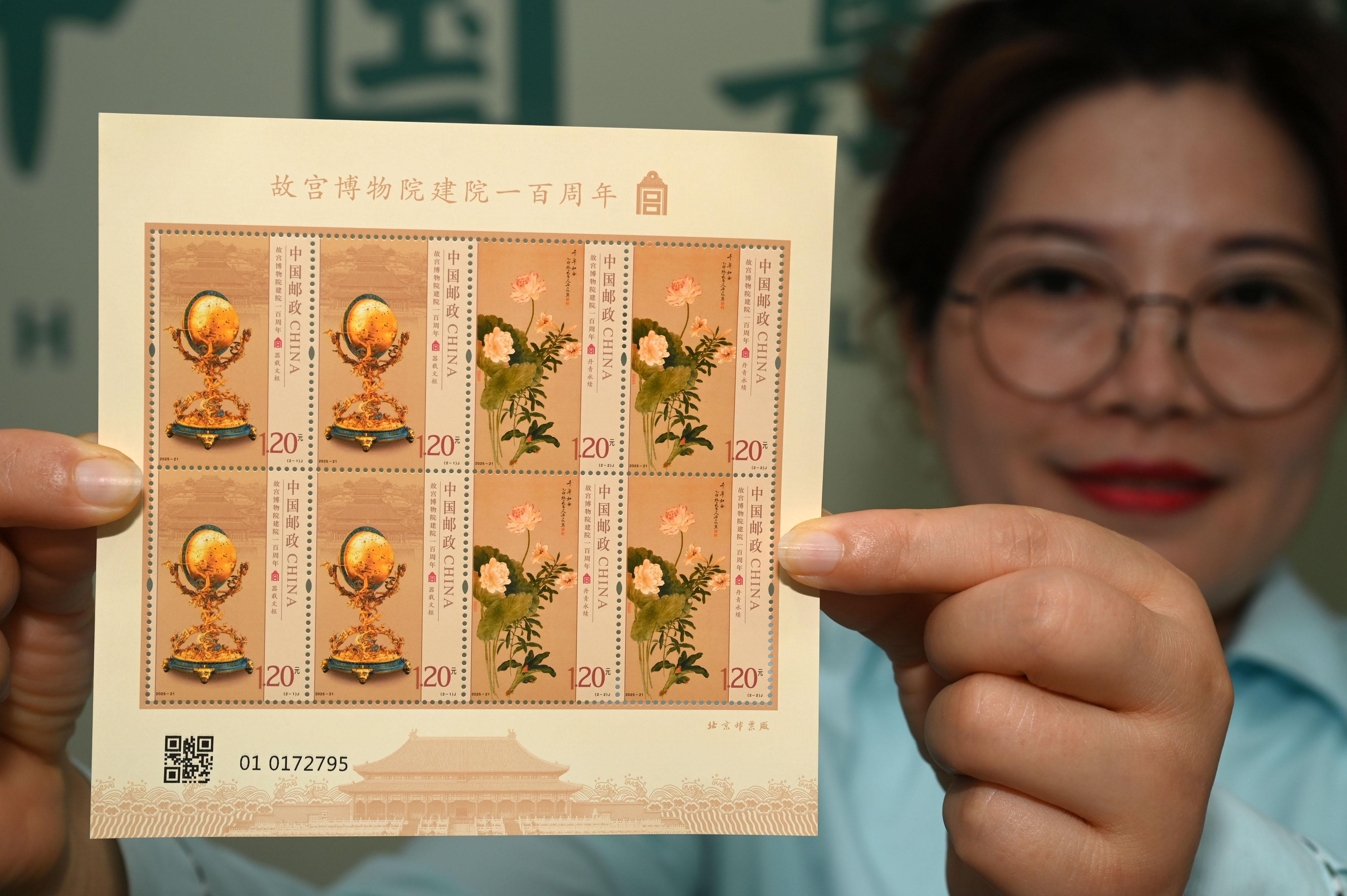 10月10日,中国邮政集团有限公司内江市东兴区分公司工作人员在展示《故宫博物院建院一百周年》纪念邮票。