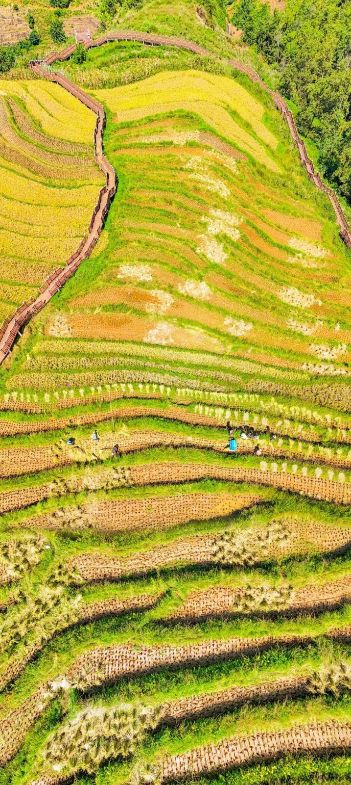 In Golden October, the 1,000-mu terraced fields in Xinshan Lisu Ethnic Township, Miyi County, Panzhihua City, are embracing a bumper harvest. Bathed in sunlight, layer upon layer of terraced fields wind along the mountain slopes; plump rice ears, draped in golden radiance, sway gently with the wind. The figures of the Lisu people bending over to harvest weave through the fields, slowly unfurling a harvest scroll of "golden rice waves rolling and diligent people amid beautiful scenery" in the mountains at an altitude of 1,600 to 2,000 meters.