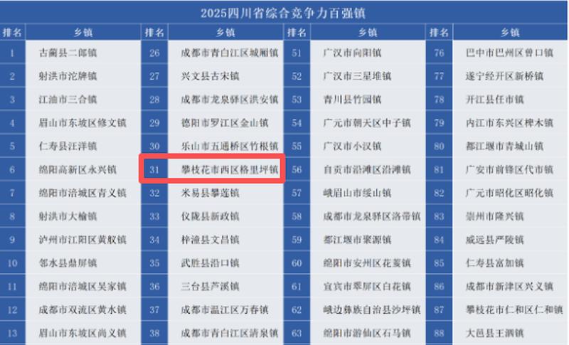 近日,竞争力智库、北京中新城市规划设计研究院等机构在北京联合发布《四川省乡镇综合竞争力报告2025》,揭晓“2025四川省综合竞争力百强镇”名单。攀枝花市西区格里坪镇凭借强劲的综合实力成功入选,位列全省第31名。