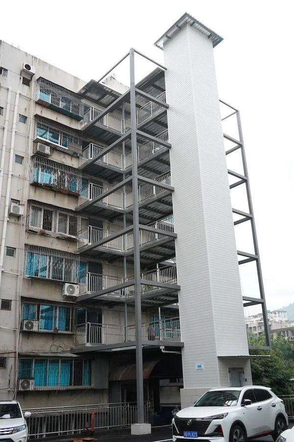 该楼栋因地势原因,电梯加装采用了错层设计,电梯从3楼和4楼之间的平台小广场向上搭建。