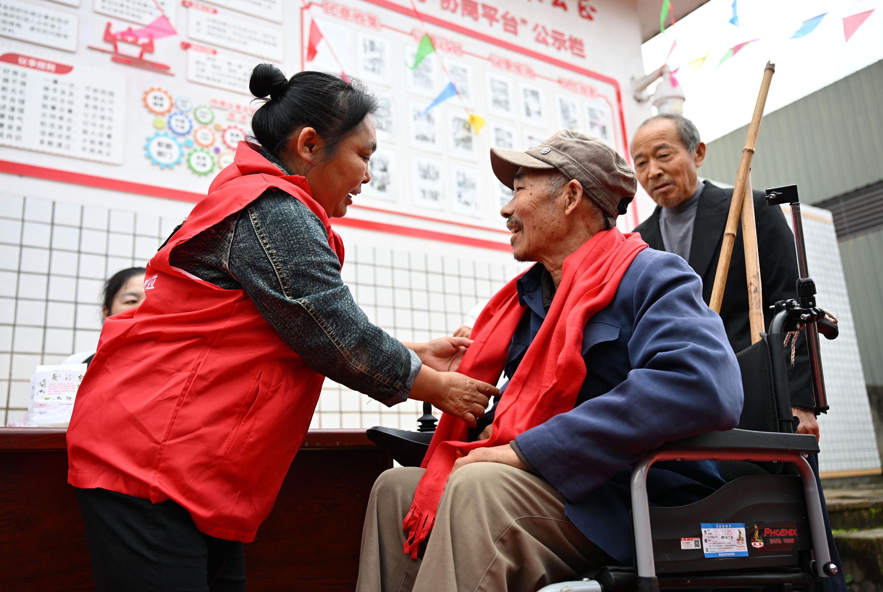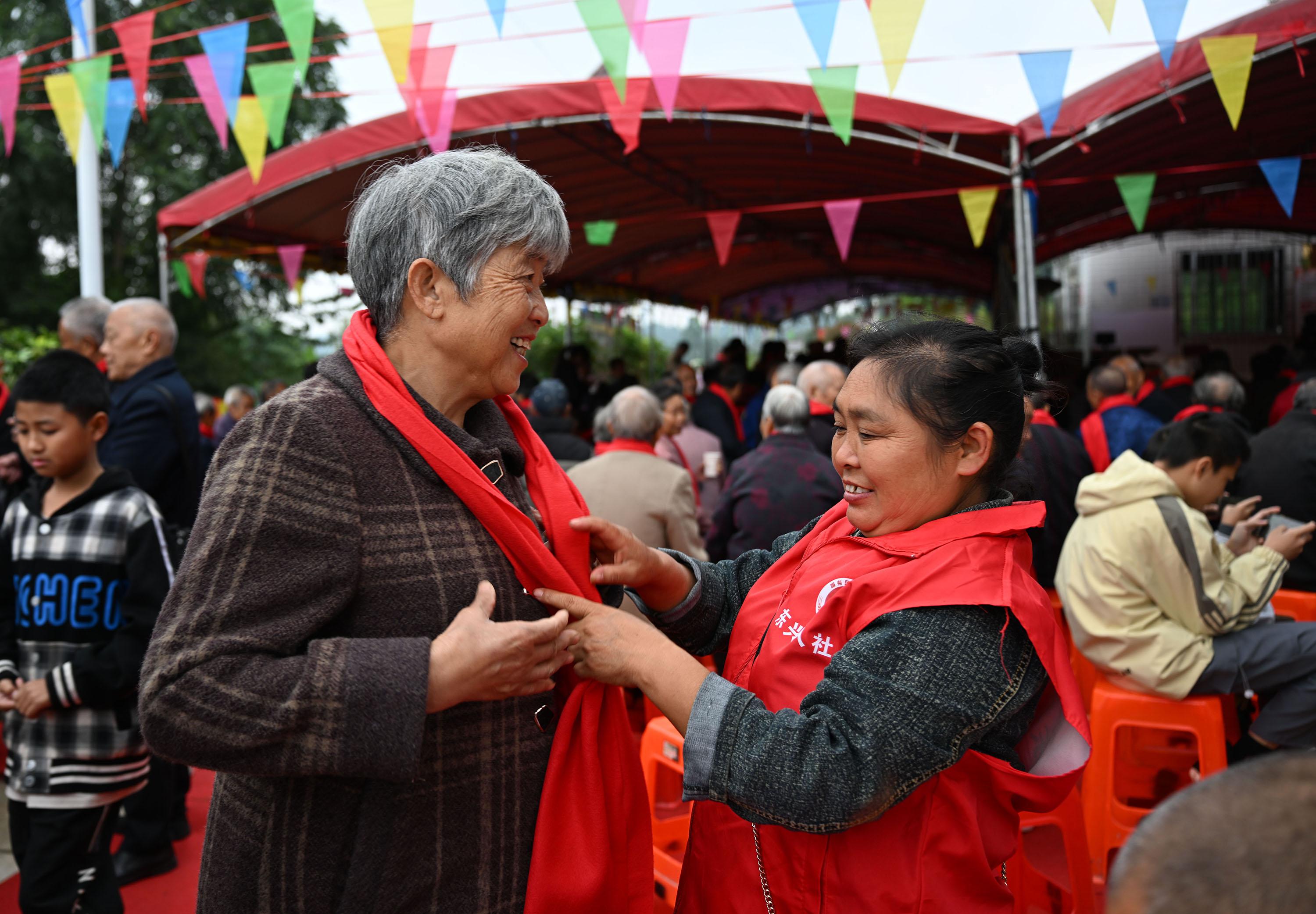 10月25日,在内江市东兴区永福镇鲤鱼塘村,志愿者正在为村里的老人系上暖心的红围巾,喜迎即将到来的重阳节。