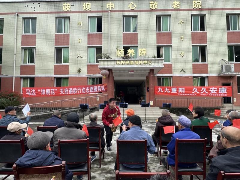 志愿者们为老人们朗诵了杨绛先生的《善待暮年的自己》,教老人们做手指操,为老人们表演文艺节目。电吹管合奏《雁南飞》《牧羊曲》《女儿情》,萨克斯合奏《爱的奉献》《搀扶》,女声独唱《好人一生平安》,都是老人们平常喜爱的曲目,不停地挥旗与演员互动。特别是邓启新老师的萨克斯独奏《天路》,边吹边和老人们互动,不少老人竟然听得情不自禁流下激动的泪花。