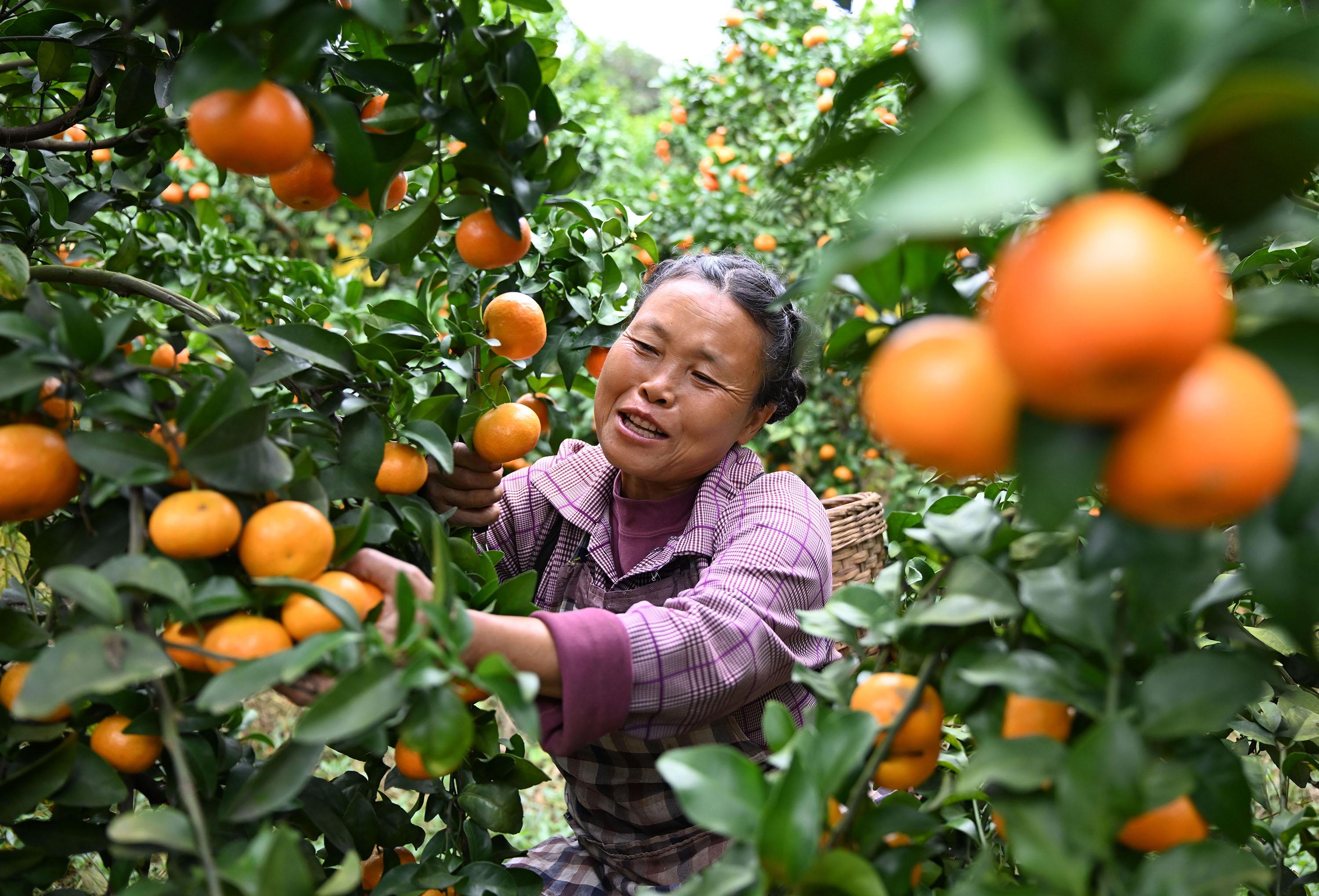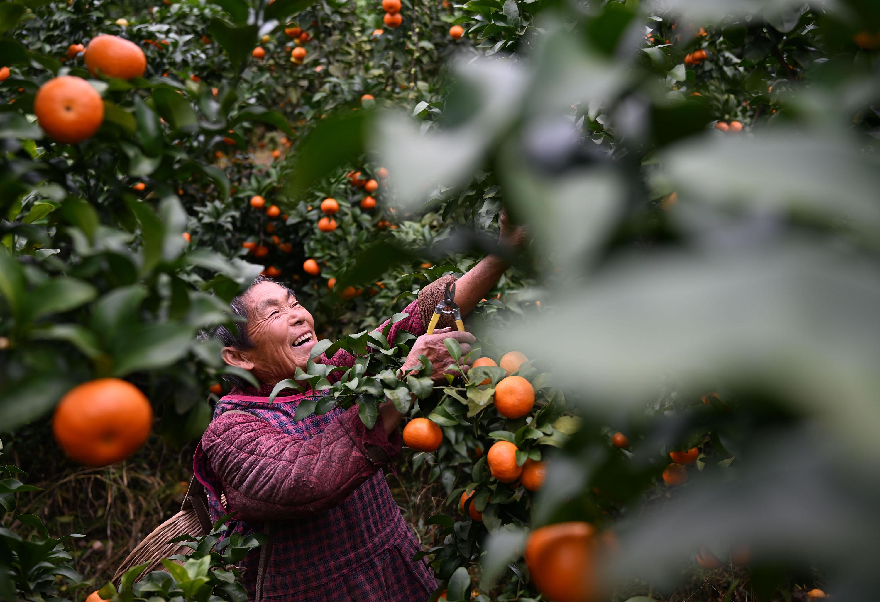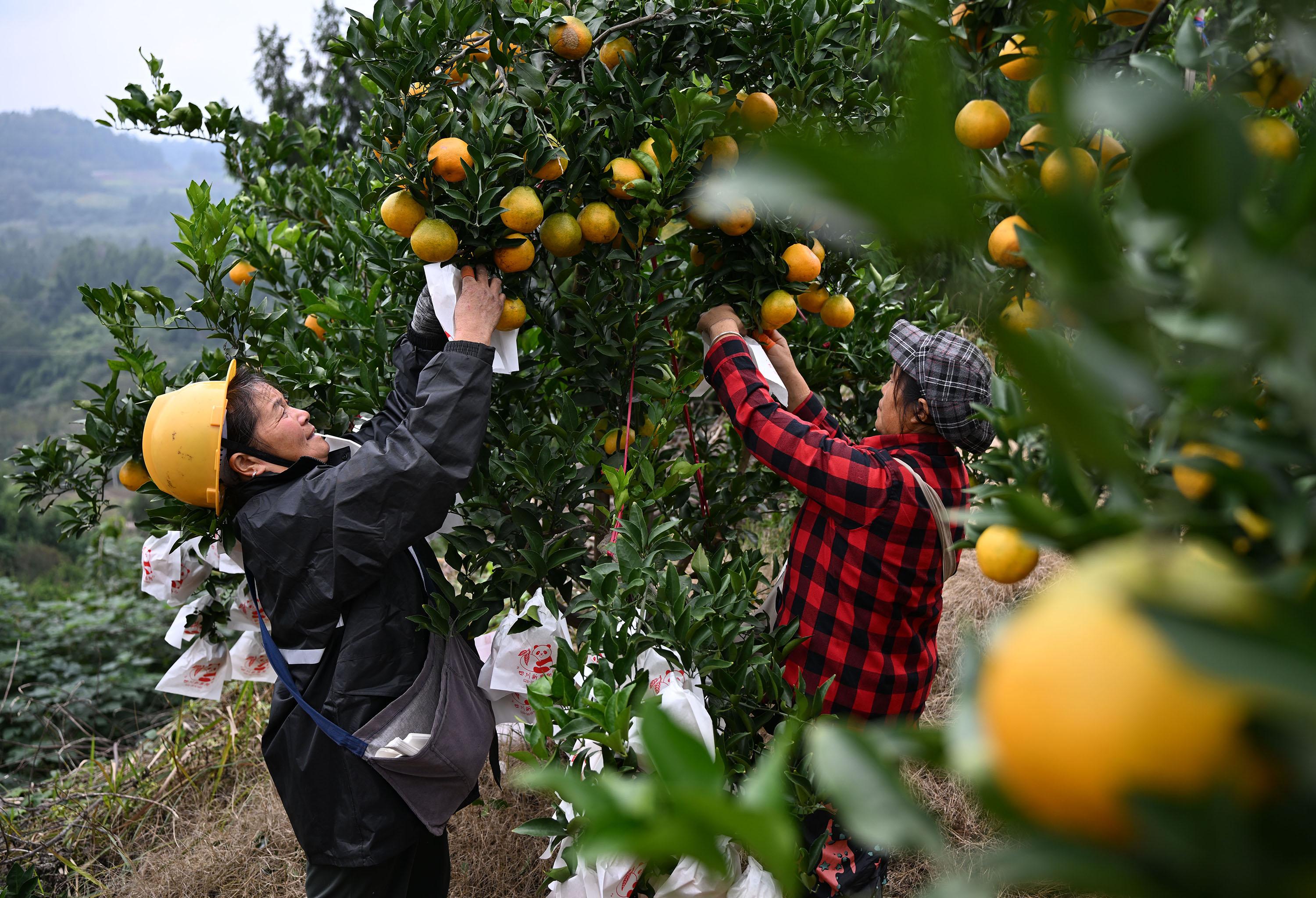 11月7日,在内江市东兴区富溪镇天赐村,果农忙着采收砂糖桔。