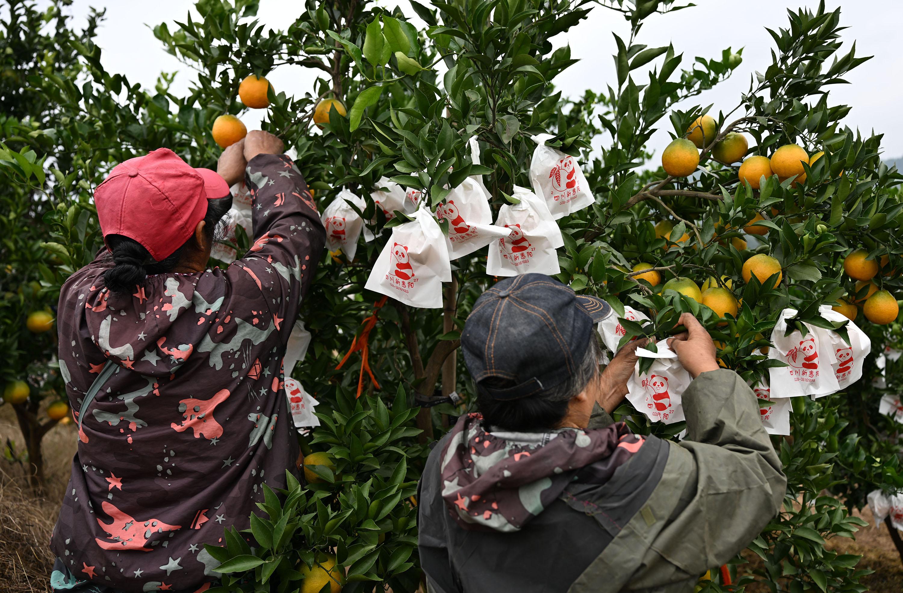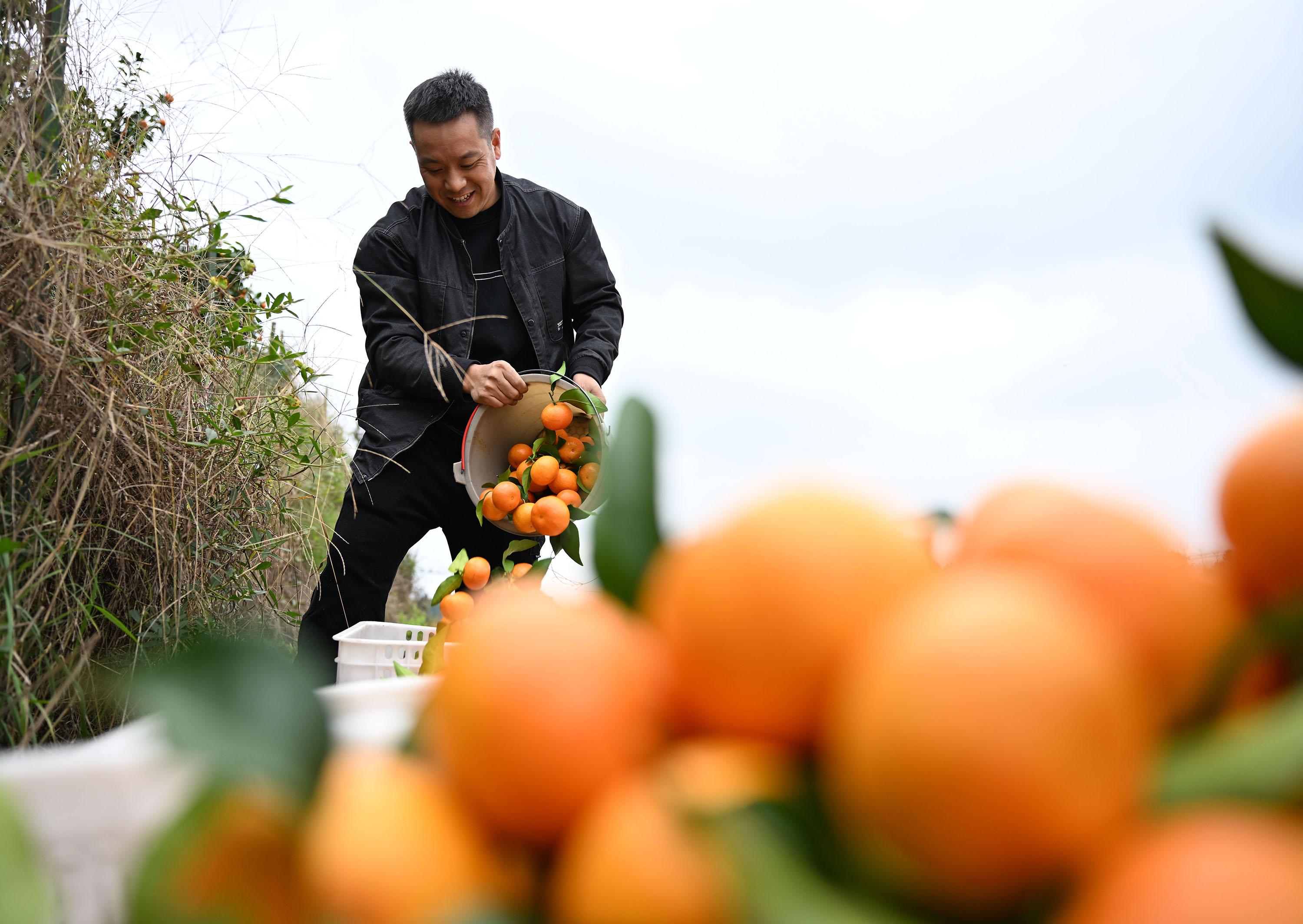 立冬时节,内江市东兴区富溪镇天赐村漫山遍野的柑橘园里,黄澄澄的果实缀满枝头,丰收在望。当地及时组织力量采收砂糖桔,开展柑橘套袋作业,确保“甜蜜”产业丰产丰收,各柑橘园的山间地头一派繁忙景象。(文/图 李建明)