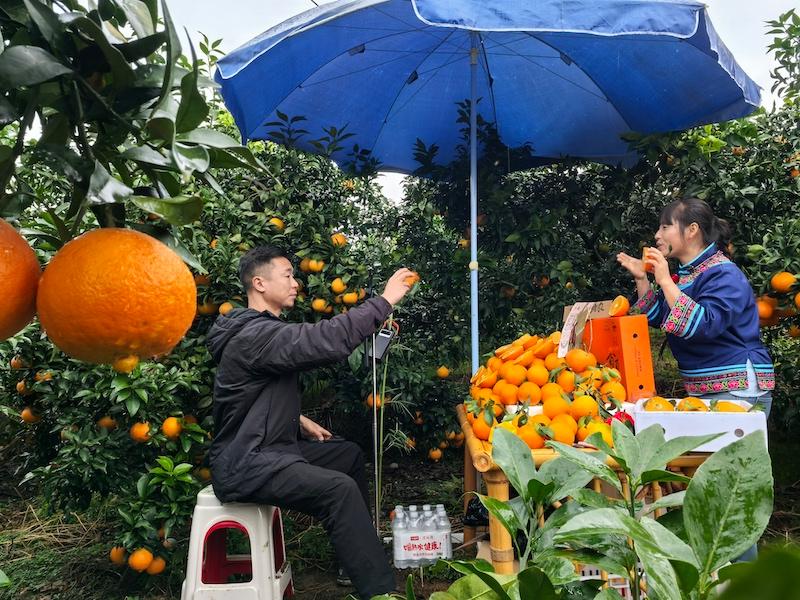 “哥哥姐姐们,能不能看到果汁儿?我们的果子是能看到果汁儿的果子……”果园里,一部手机架在三脚架上,一名主播正对着镜头展示刚采摘的柑橘,声音格外洪亮。“直播间所见即所得,爱媛果冻橙,产地直发!”