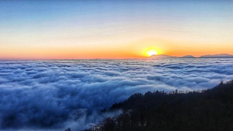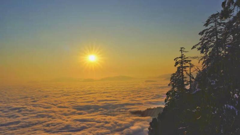 清晨,红日冉冉升起,云海也不甘落后瀑布流云的云海和日出的赤橙黄白相交错惊艳了整个冬日。