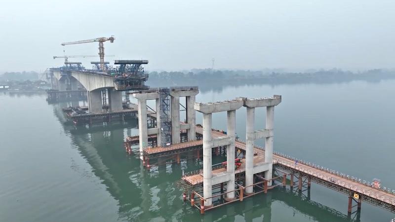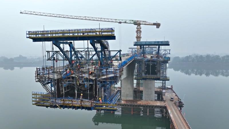 从高空俯瞰,大桥雄姿初显,正在从一个个独立的桥墩向连贯的桥面延伸;引桥部位,下部结构已全部完工,桥墩整齐林立,主桥巨大的连续刚构桥体从两岸向江心伸展;施工平台上,焊花飞溅,技术人员正在进行精准定位和焊接作业,向着最终的合龙点稳步推进。