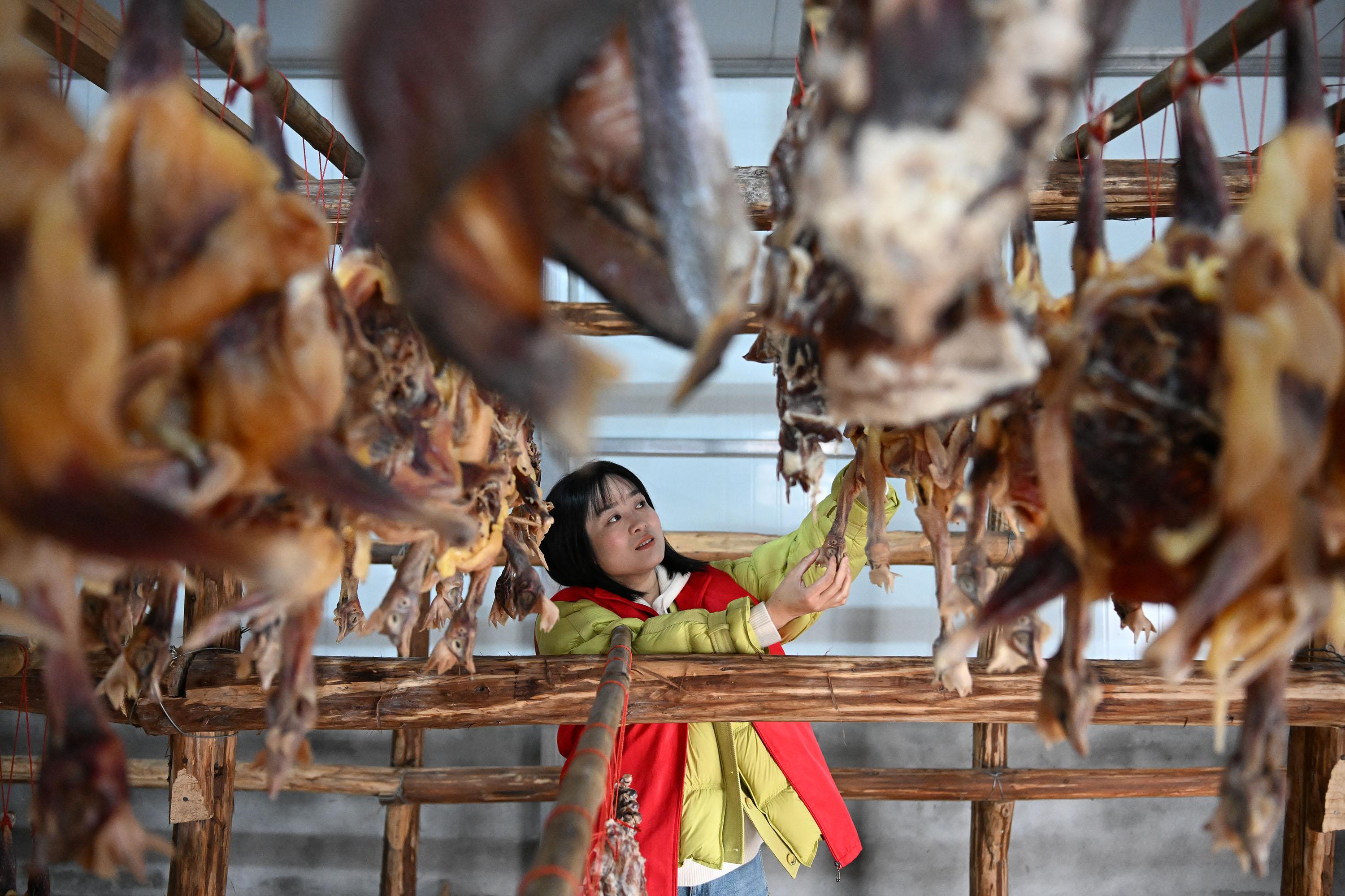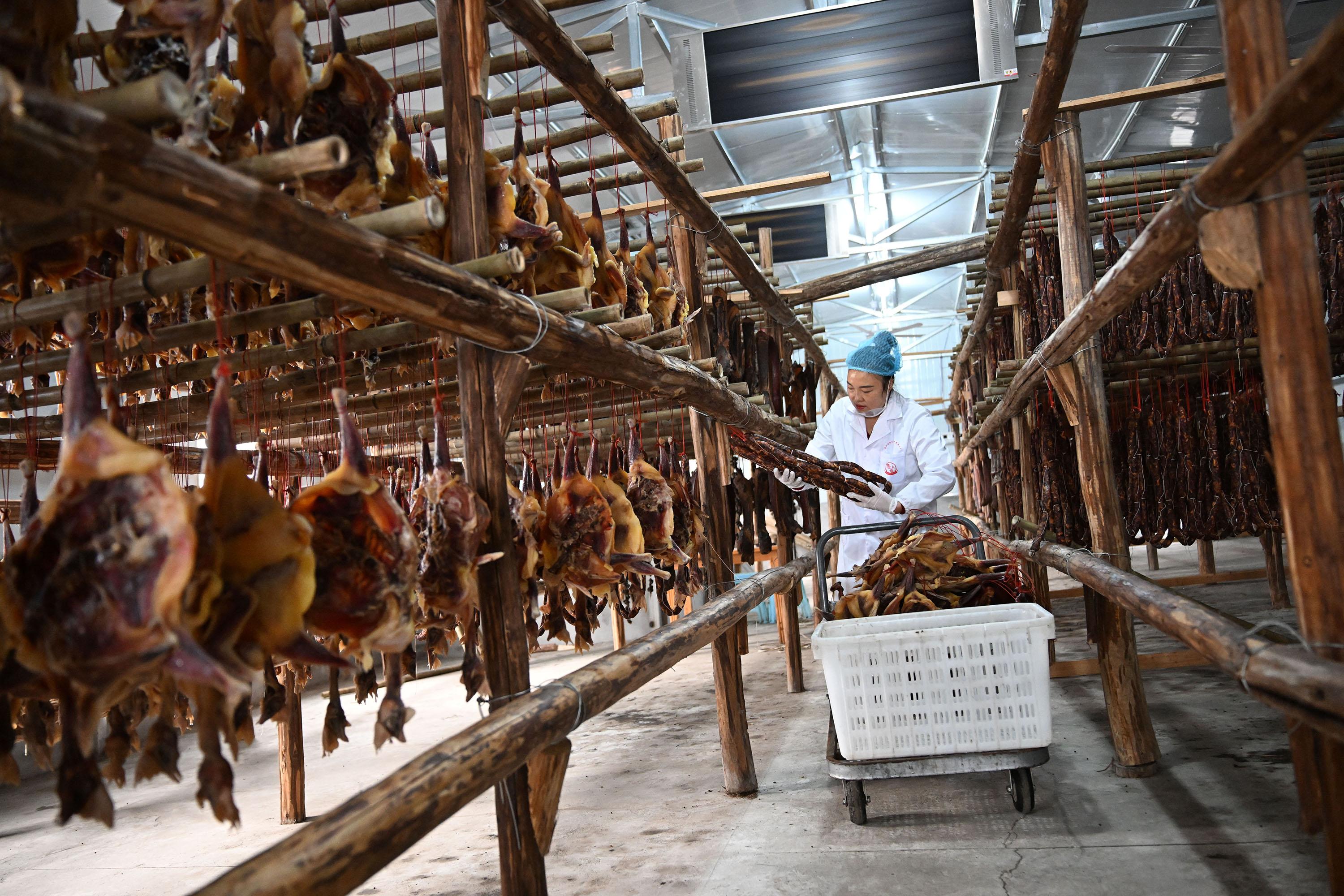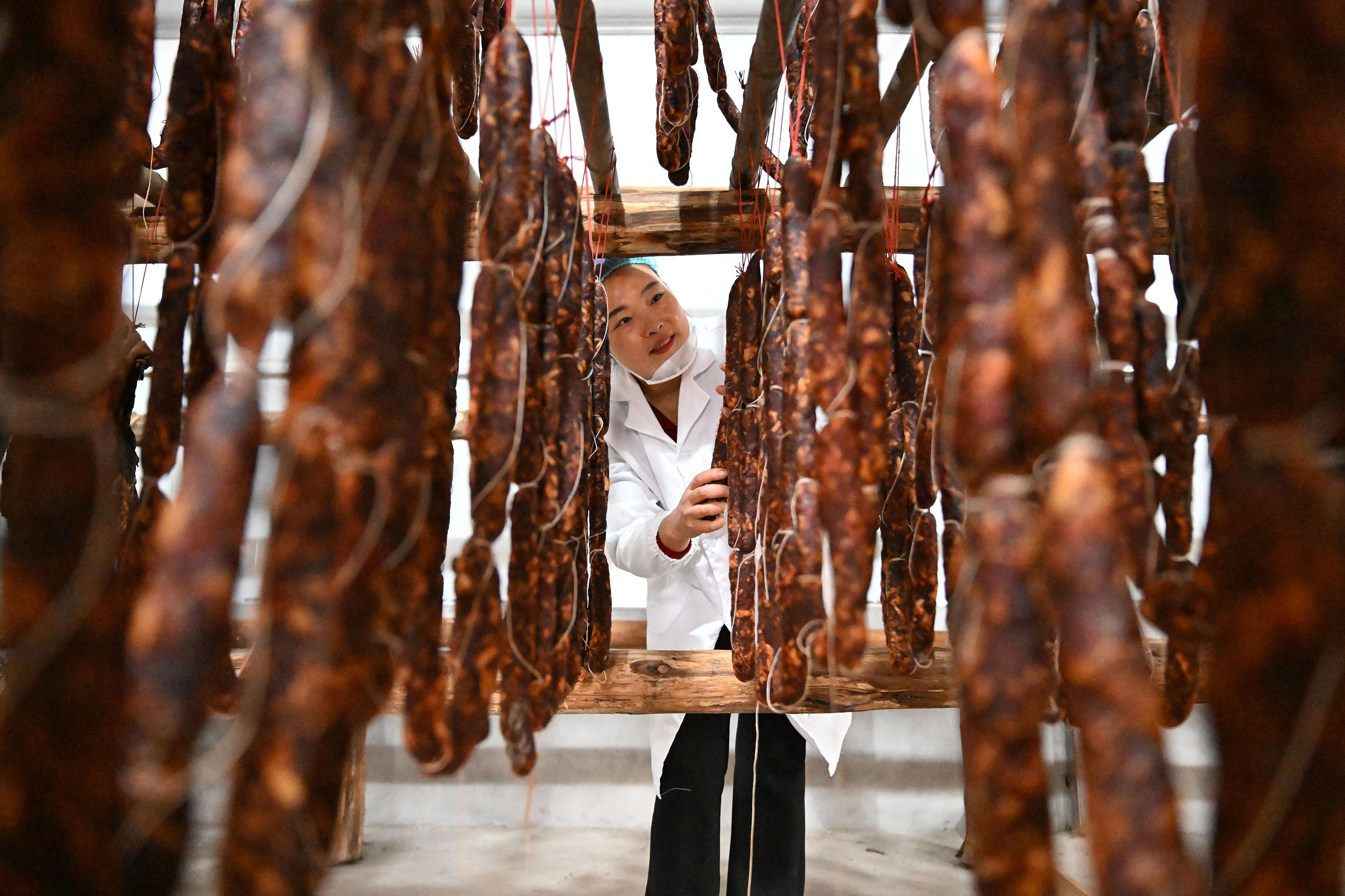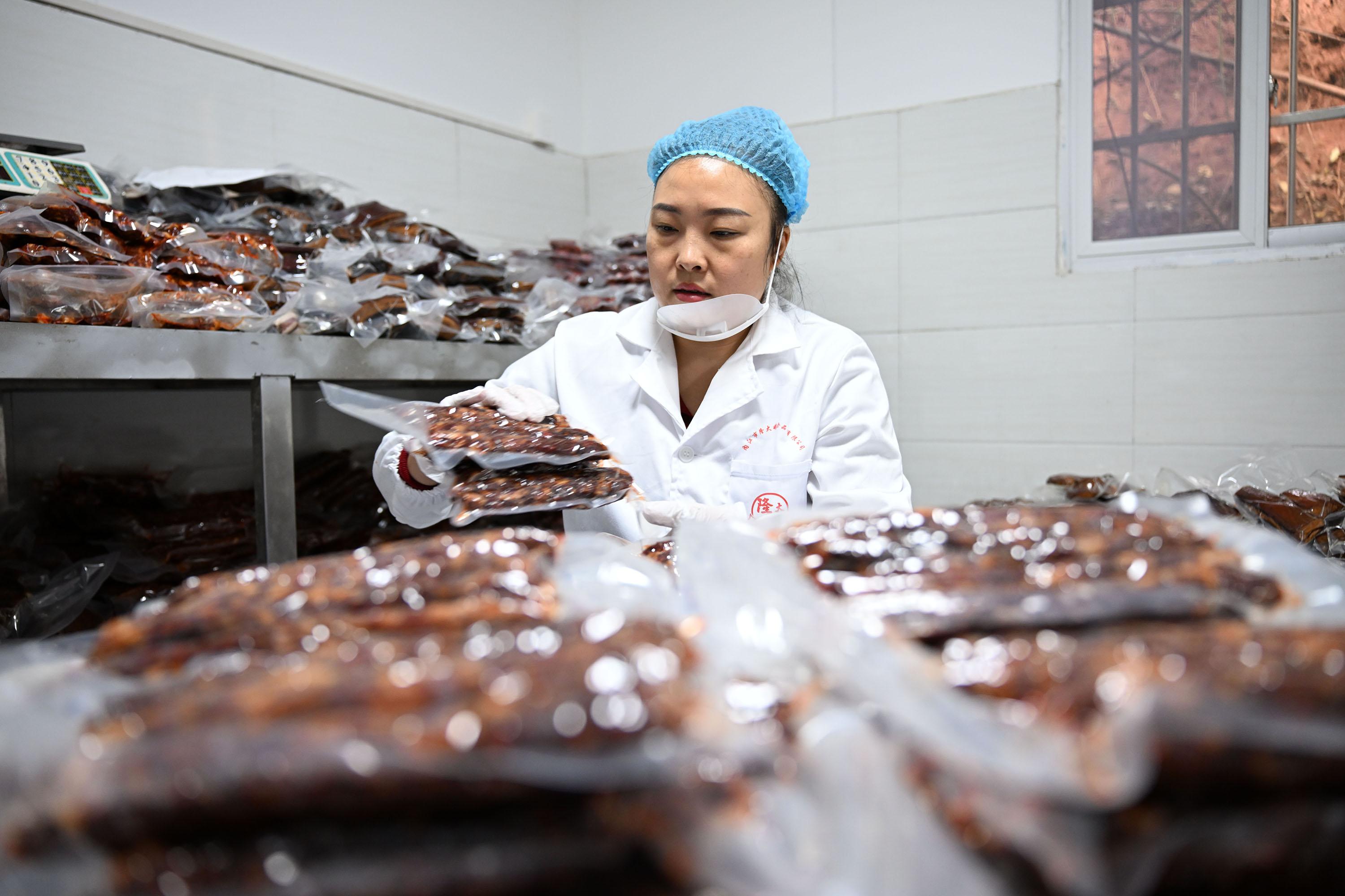 12月10日,在内江市东兴区田家镇火花村,工人在内江市隆大娘食品有限公司赶制腊味食品订单。